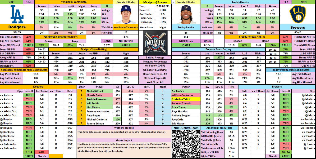 - Yoshinobu Yamamoto (LAD) brings a stellar 2.51 ERA with 43% NRFI rate and electric stuff