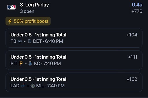 🎯3 Leg Parlay using either Draftkings or Fanduel NRFI/YRFI Boost