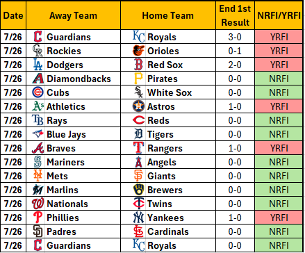 Yesterday there were 10 NRFIs and 6 YRFIs. 2 Home Runs were hit in the first Inning of all games yesterday. No site picks yesterday. Thanks for using NRFI-Central.com! If you’ve found value in our data and picks, consider supporting the site — every bit helps keep the insights coming. Post navigation Recap of July 11, 2025 Recap of July 27, 2025