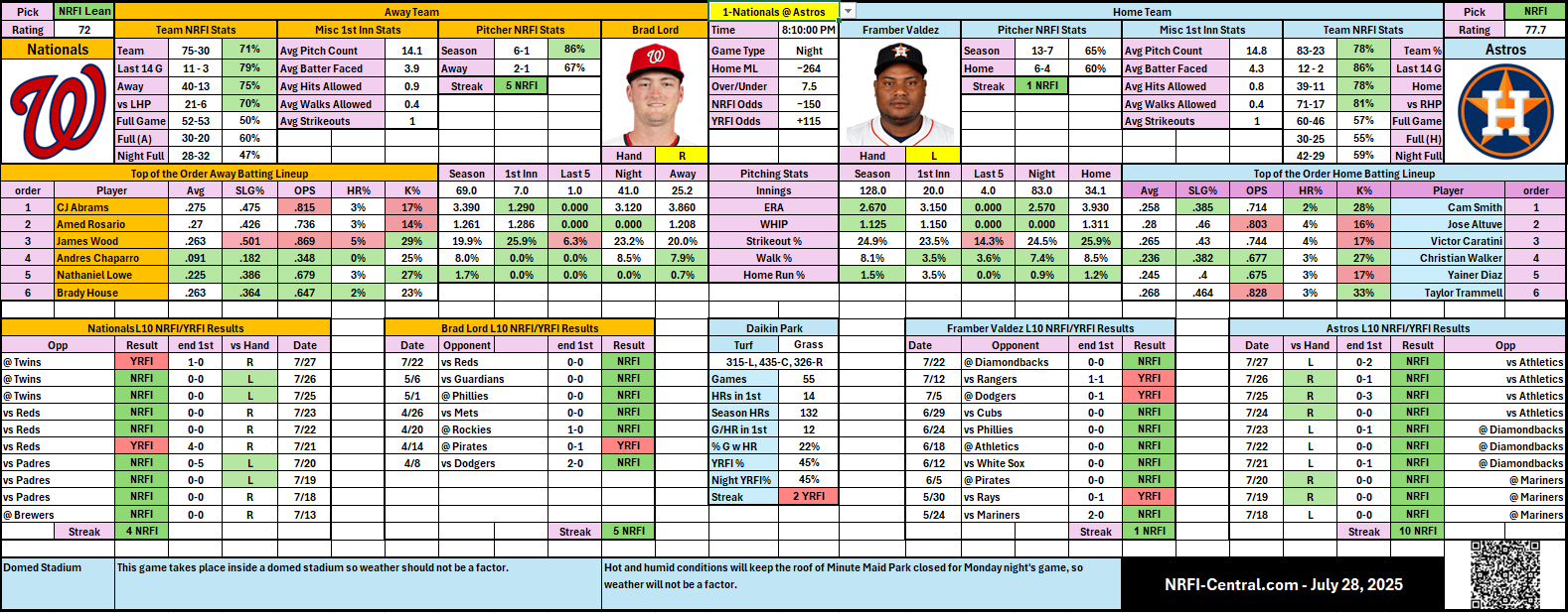 - ⭐ Framber Valdez (HOU): Solid 65% NRFI this season, significantly sharper at home with impressive early-inning control.