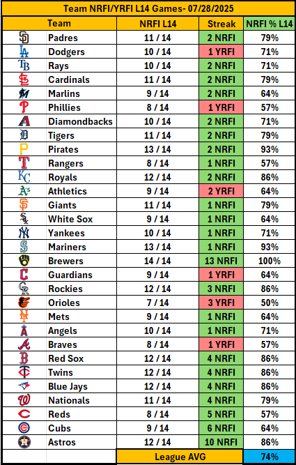- 🍺 Brewers hitters are even colder, extending a remarkable 13-game NRFI streak.