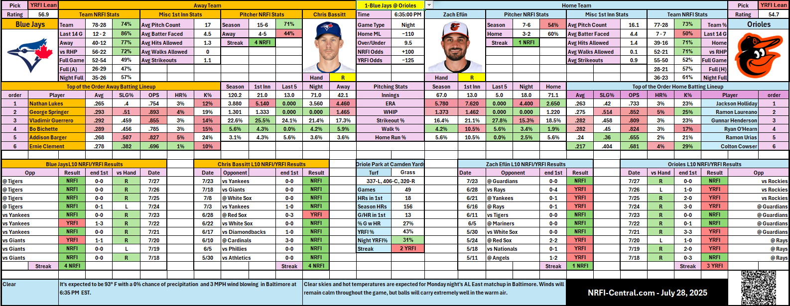 - ⚠️ Zach Eflin (BAL) has struggled mightily with a low 54% NRFI rate this season and an alarming 7.62 ERA in first innings, giving up significant hard contact (10.5% HR rate in opening frames).