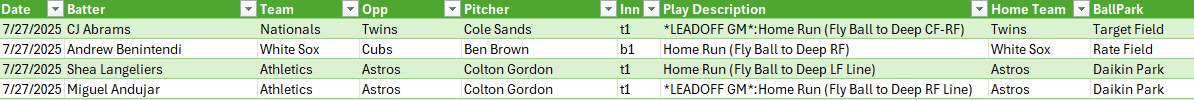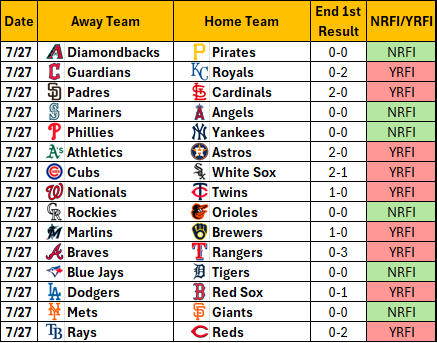 Yesterday there were 6 NRFIs and 9 YRFIs. 4 Home Runs were hit in the first Inning of all games yesterday. No site picks yesterday. Thanks for using NRFI-Central.com! If you’ve found value in our data and picks, consider supporting the site — every bit helps keep the insights coming. Post navigation Recap of July 26, 2025 Recap of July 28, 2025