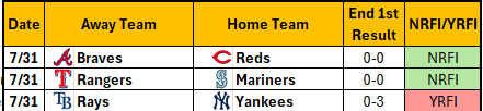 Yesterday there were 2 NRFIs and 1 YRFIs. 1 Home Run was hit in the first Inning of all games yesterday. No model picks yesterday Thanks for using NRFI-Central.com! If you’ve found value in our data and picks, consider supporting the site — every bit helps keep the insights coming. Post navigation Recap of July 30, 2025 Recap of August 1, 2025