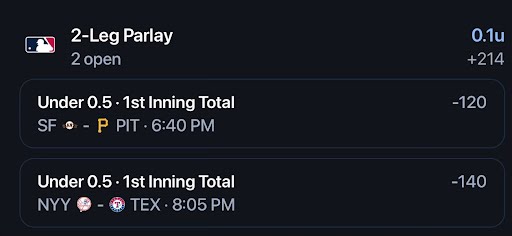 - Giants/Pirates NRFI ❌ (no longer valid as pitching change occurred) (pick will still be tracked)