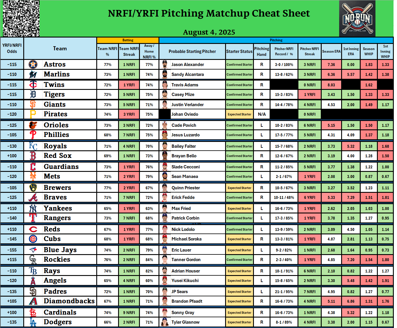 - Check out our free detailed NRFI Cheat Sheets
