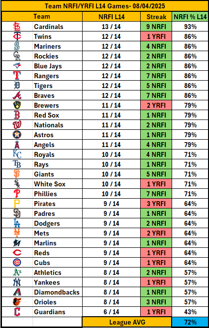 - 🏴☠️ Pirates similarly sluggish at the start, registering NRFIs in 7 of their last 10 games, with minimal power threat early on.
