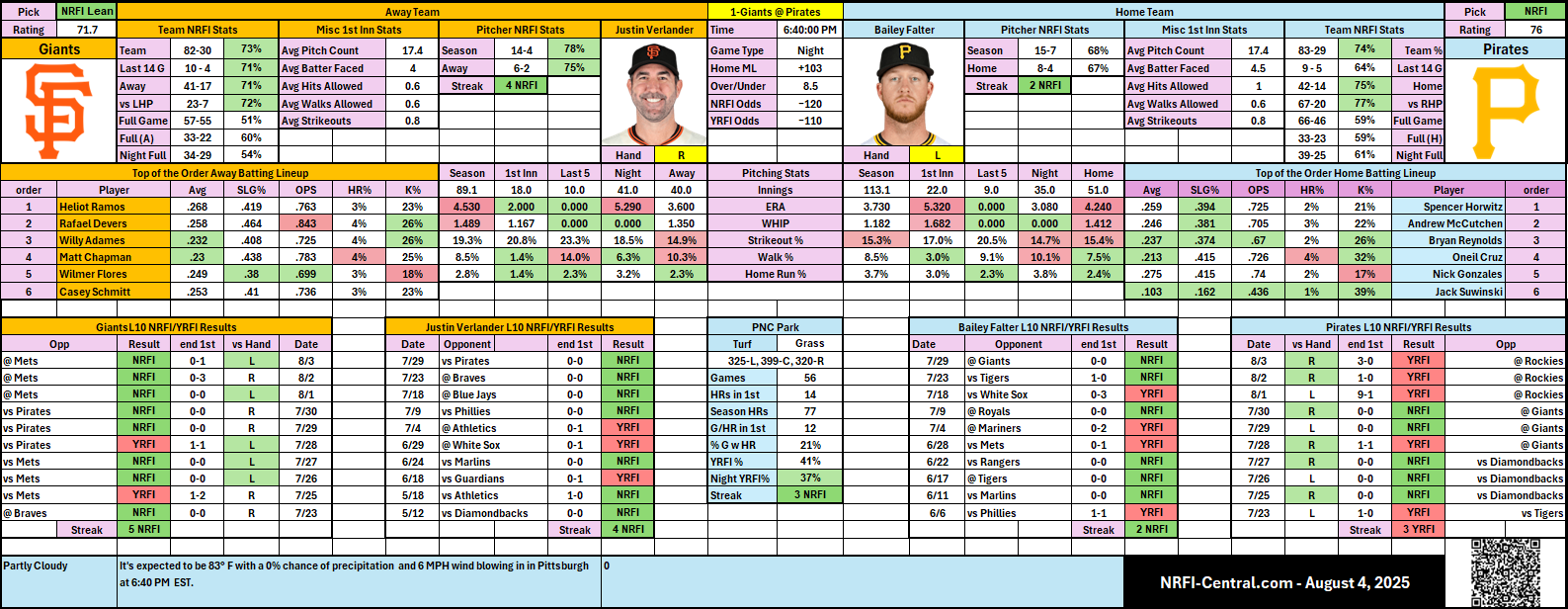 - ⭐ Justin Verlander (SF) brings veteran dominance with a strong 78% NRFI success rate this season, and a perfect recent form (4 straight NRFIs). He consistently limits early damage with a stellar 2.00 ERA in first innings.