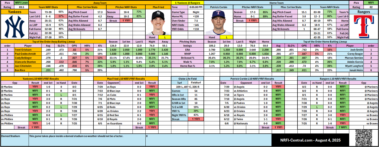 - 🤠 Patrick Corbin (TEX) is even sharper with an outstanding 85% NRFI success overall and a dominant home record (8-1 NRFI at home).