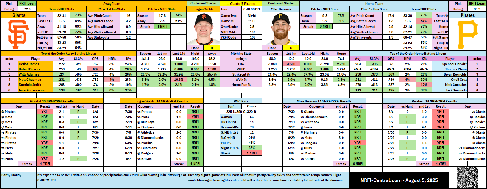 - 🌙 Ideal NRFI conditions tonight (partly cloudy, mild breeze inward), further limiting home run potential at pitcher-friendly PNC Park (59% overall NRFI rate).