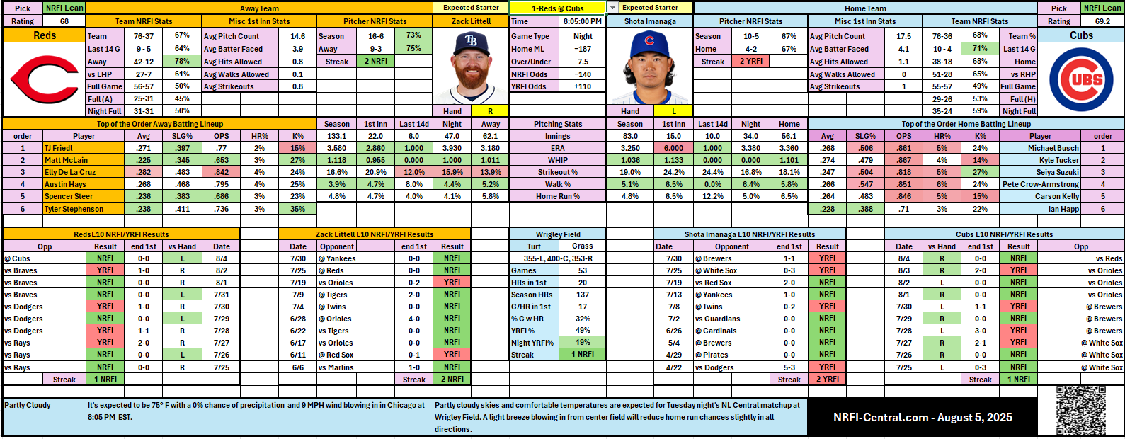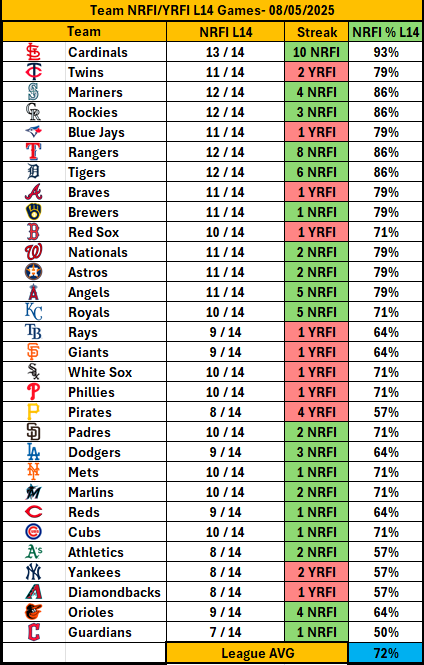 - 🔥 Zack Littell (CIN) is in top NRFI form (73% NRFI, 9-3 road NRFI) with excellent recent consistency, allowing minimal early threats.