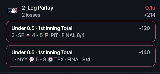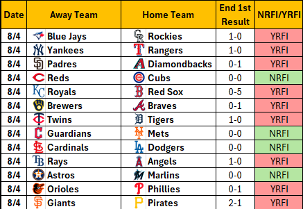 Yesterday there were 4 NRFIs and 9 YRFIs. There were 5 HRs hit in the 1st Inning of games yesterday. Model picks wen 0-2: Thanks for using NRFI-Central.com! If you’ve found value in our data and picks, consider supporting the site — every bit helps keep the insights coming. Post navigation Recap of August 3, 2025 Recap of August 5, 2025