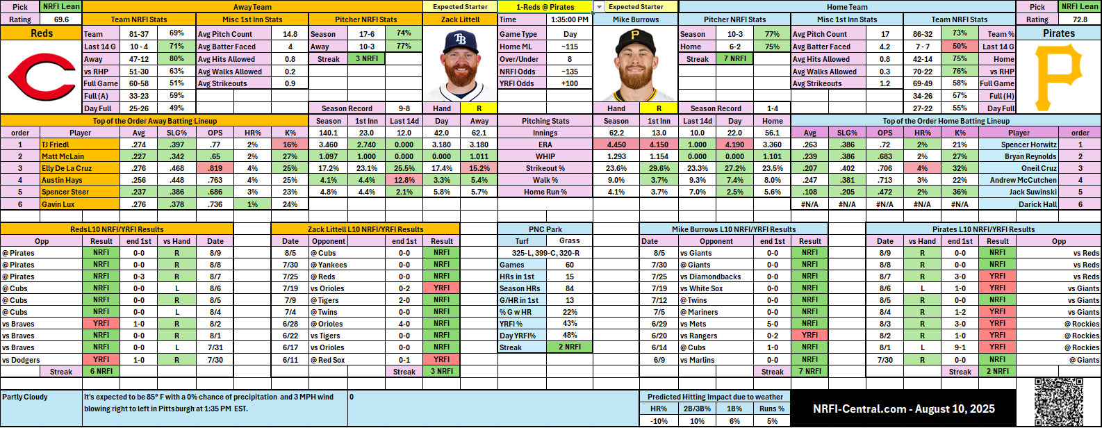 - 📊 Team Trends – Reds 69% NRFI overall; Pirates 73% NRFI overall.
