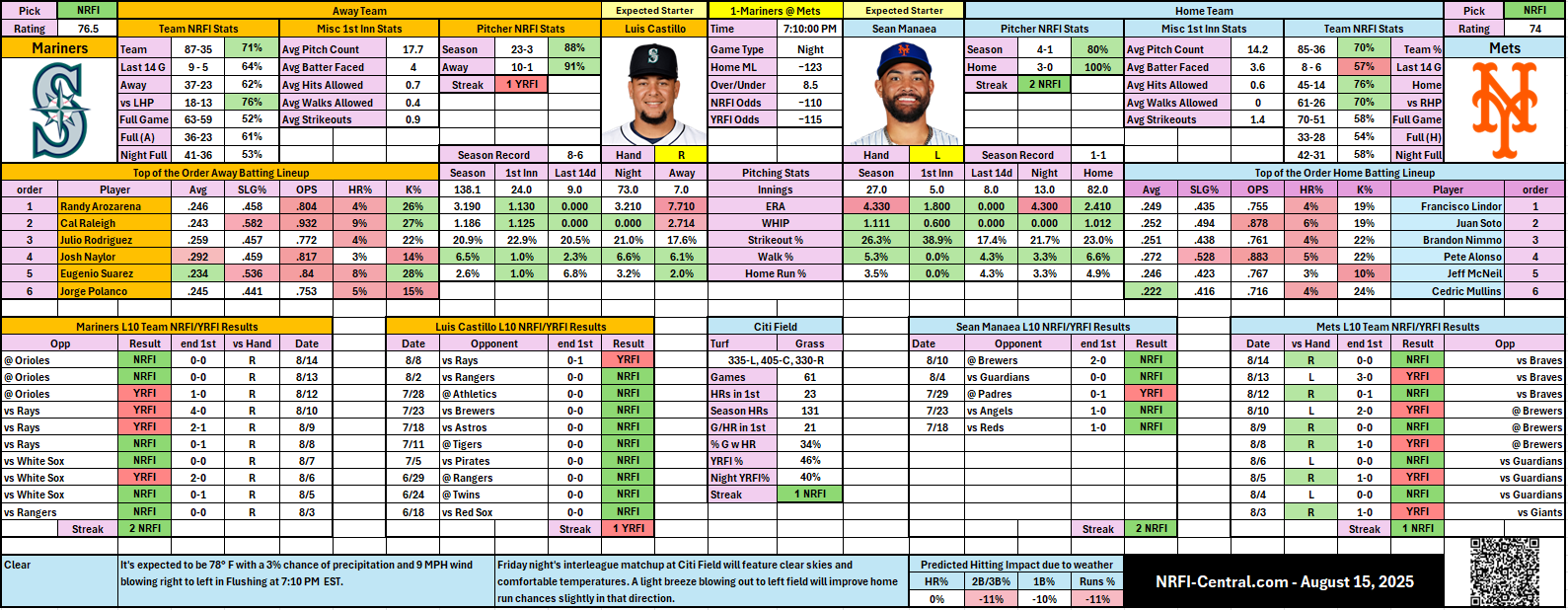 🏆 Luis Castillo – 88% NRFI on the season, 91% on the road; dominant early with a 1.13 ERA and 0.92 WHIP in the 1st inning.