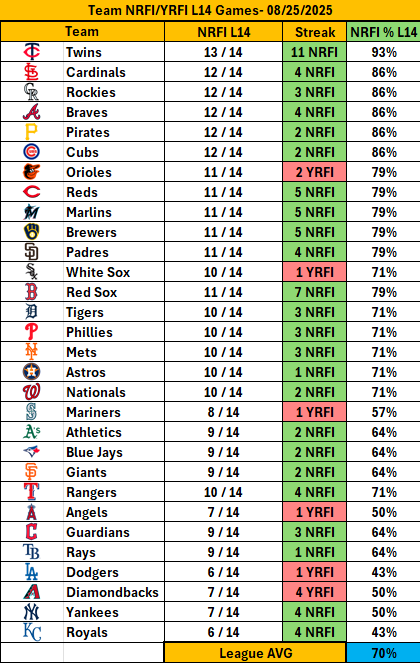 - 📉 Mariners: 71% NRFI overall, 67% last 14 games.