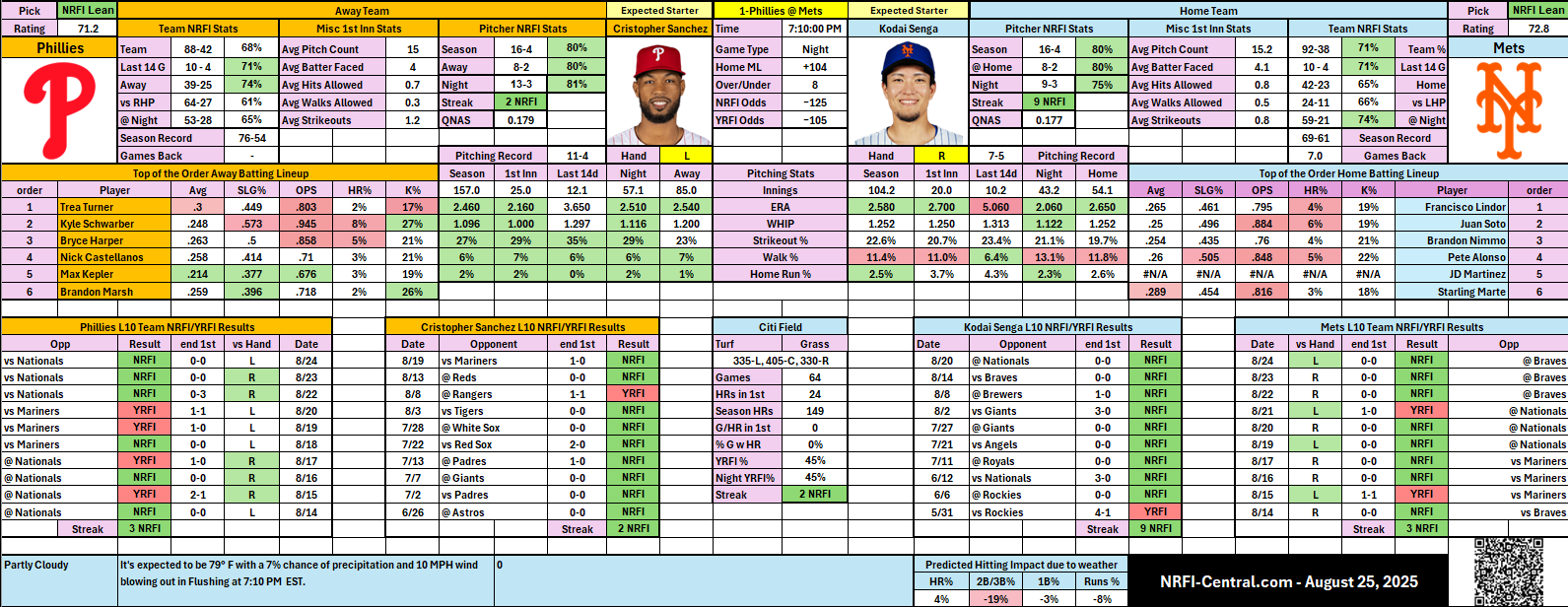 - 🧢 Kodai Senga (NYM): 16–4 NRFI (80%), 9 straight NRFIs, dominant strikeout numbers (22.6%).