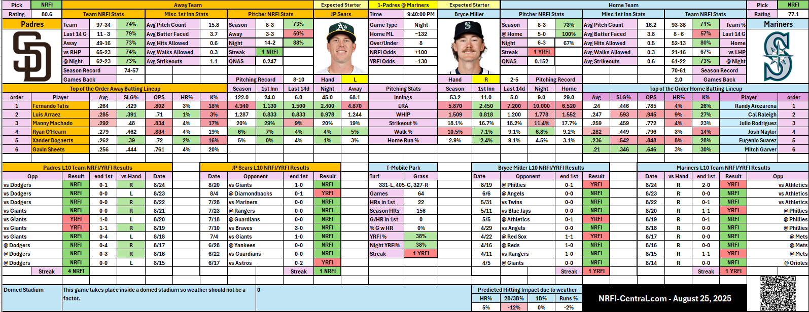 ⚾ Padres @ Mariners – NRFI