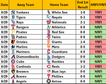 Yesterday there were 8 NRFIs and 7 YRFIs.