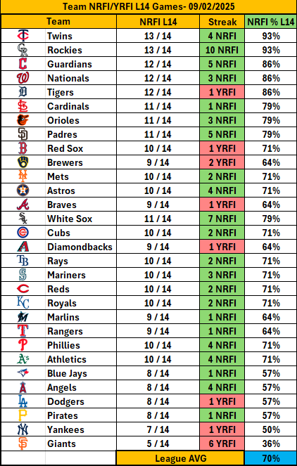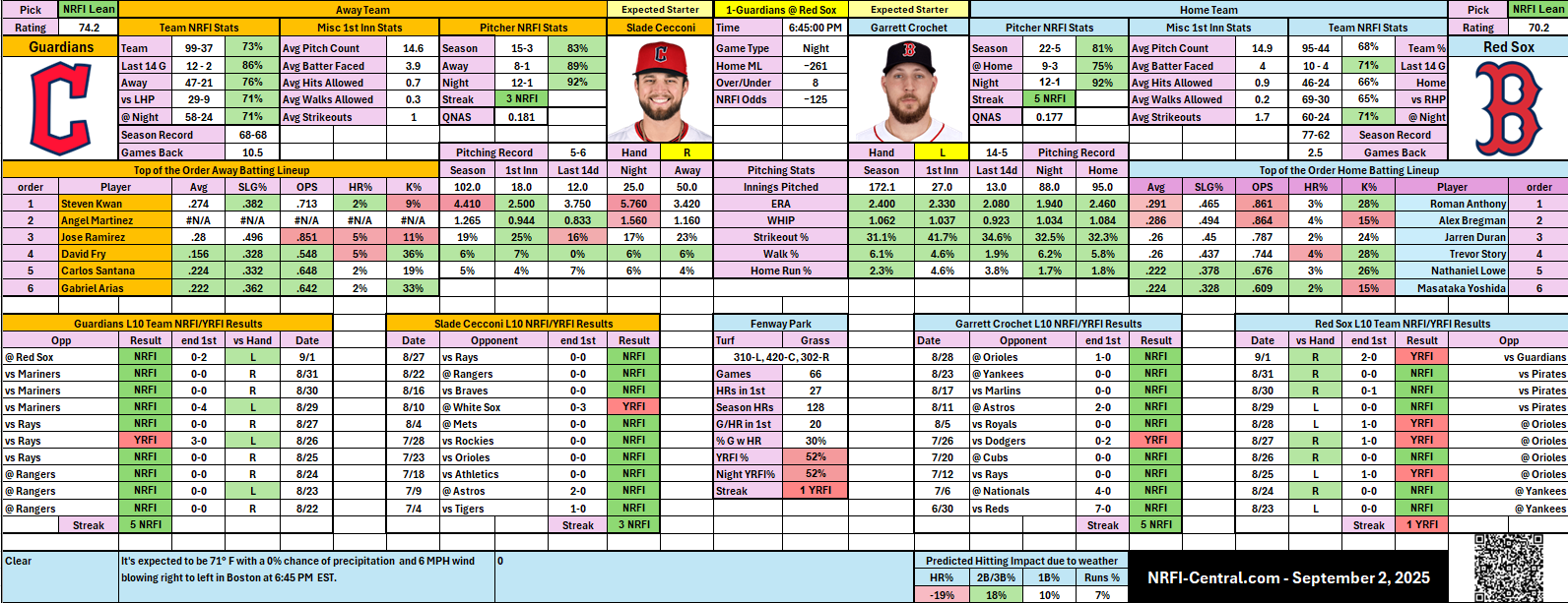 📊 Team Trends – Guardians 73% NRFI overall; Red Sox a bit weaker at 68% but trending better in August.