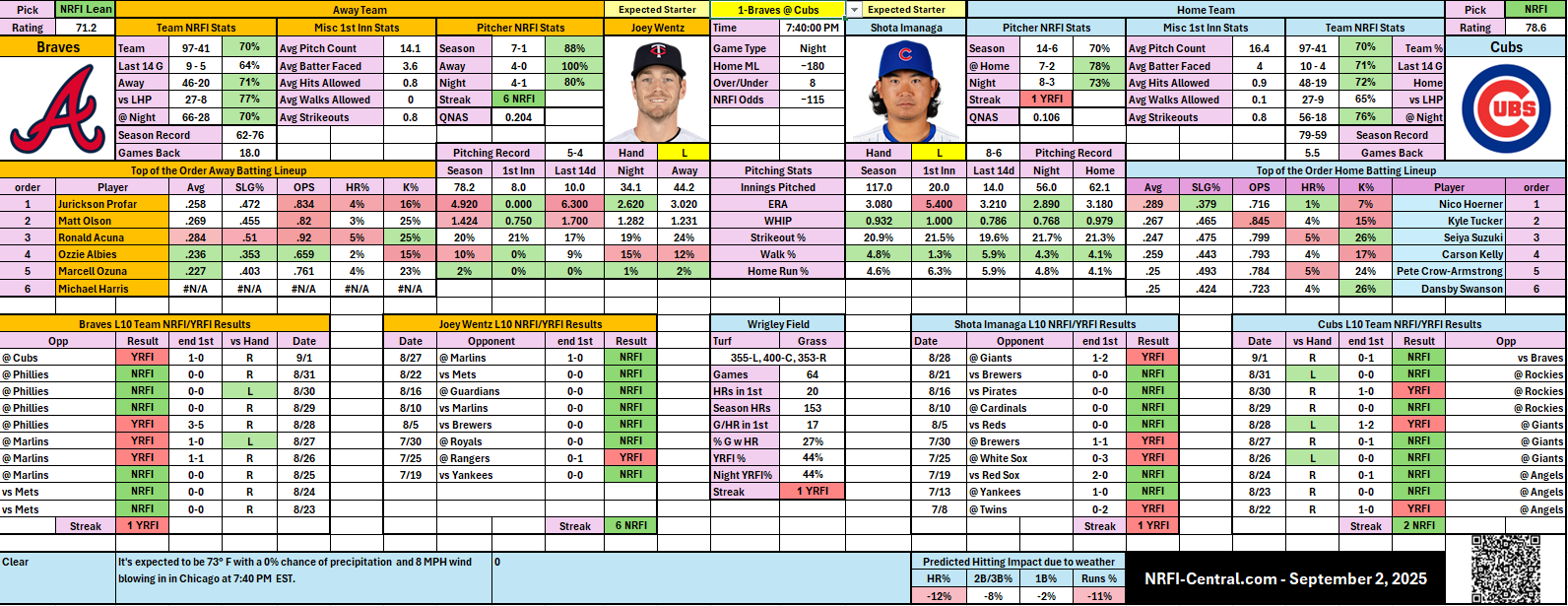 ⚔ Splits – Braves 77% NRFI vs LHP; Cubs 72% NRFI vs LHP.