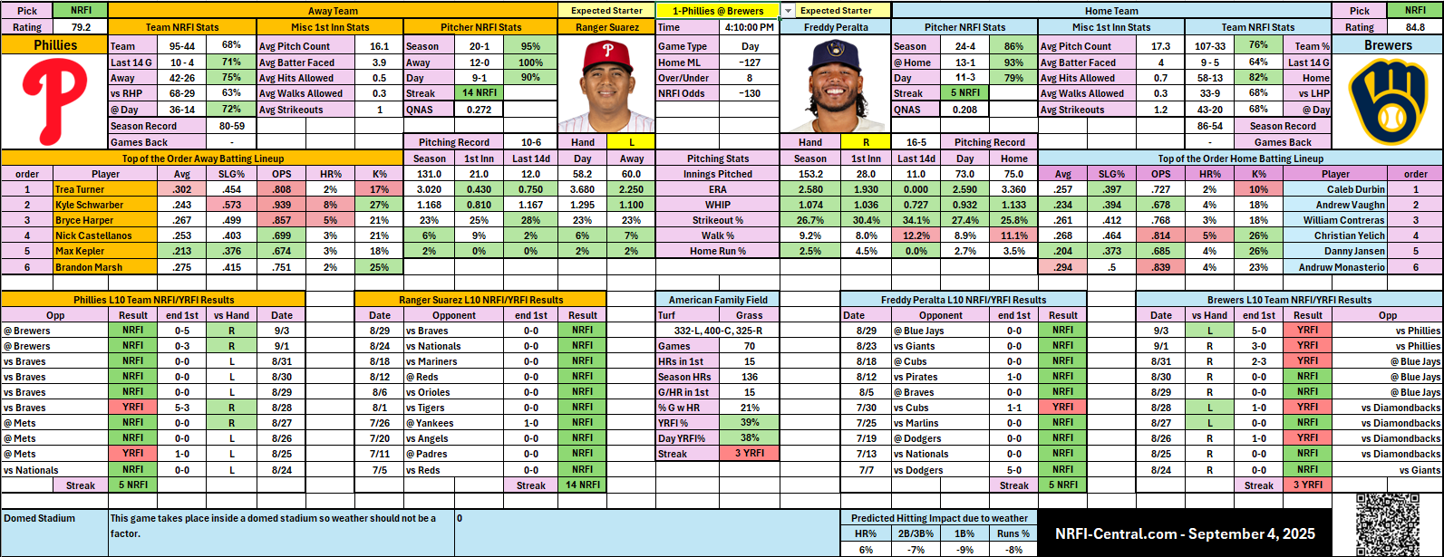⚔ Splits – Phillies offense has been hot late, but they’re only 68% NRFI overall; Brewers at 84% NRFI vs lefties support Peralta’s early dominance.