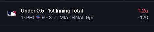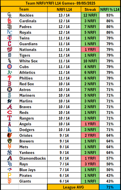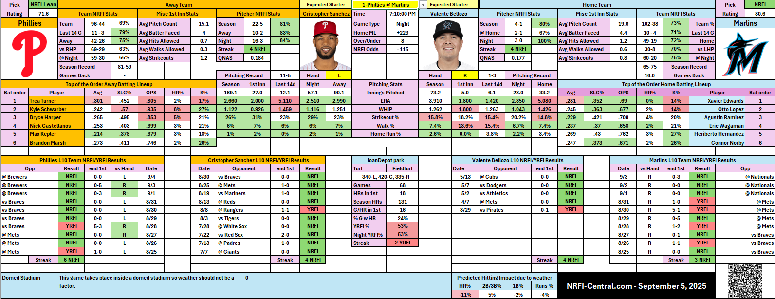 📊 Team Trends – Phillies 69% NRFI overall, 72% on the road, 71% vs RHP; Marlins 73% NRFI overall, 75% at night.