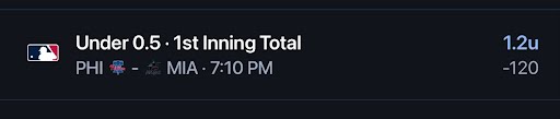 ⚔ Splits – Phillies lineup has been hot lately but sits just 69% NRFI overall; Marlins at 75% NRFI vs lefties add stability behind Bellozo.
