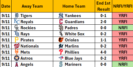 Yesterday there were 2 NRFIs and 7 YRFIs.