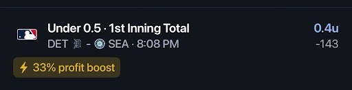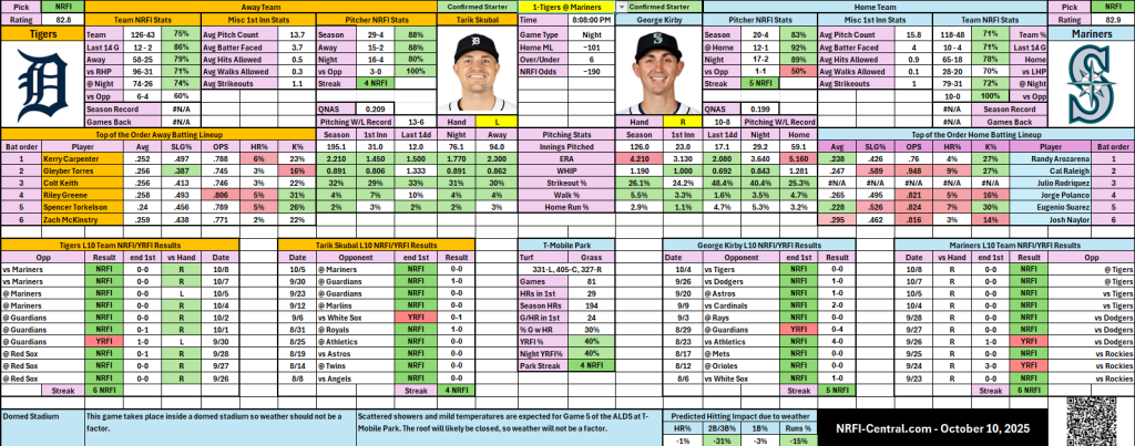 🏟 Ballpark/Weather – T-Mobile Park continues to be one of baseball’s most pitcher-friendly first-inning environments (YRFI only 40%). The roof will be closed, eliminating weather volatility.