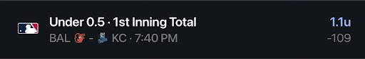 🏟 Ballpark/Weather – Kauffman Stadium slightly hitter-friendly tonight (~53% YRFI) with light wind blowing out, but not enough to significantly offset pitching dominance.