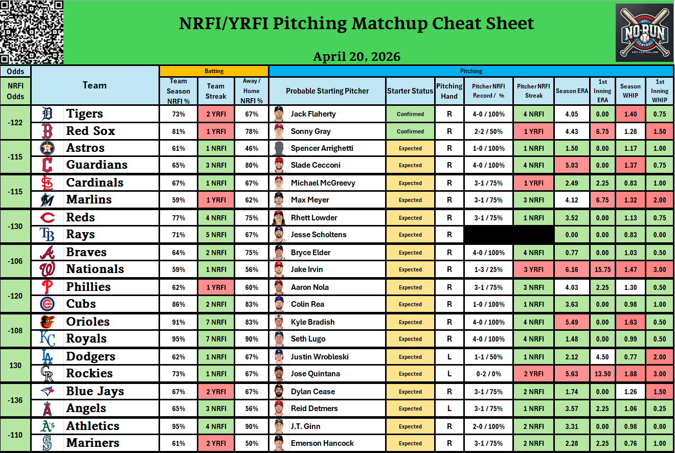 Our model takes a conservative approach when generating NRFI recommendations, considering factors like team NRFI history, pitcher performance, team batting stats, ballpark conditions, weather, and player/team streaks. Focusing on single-team NRFIs, rather than the entire game, can improve your chances by targeting specific team tendencies in the first inning. (Tip: Always check current weather conditions, as they can significantly affect ball travel in certain MLB ballparks.) Single-team NRFIs are often best used in parlays due to the heavy juice placed by sportsbooks. However, we also recommend full-game NRFIs when our model identifies a strong opportunity across both teams.