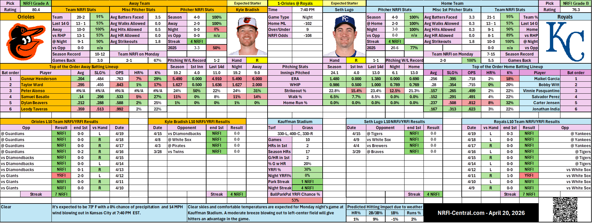 📊 Team Trends – Orioles elite at 91% NRFI (20-2) with a 7 NRFI streak; Royals also strong at 95% NRFI (21-1) and riding a 7 NRFI run themselves.