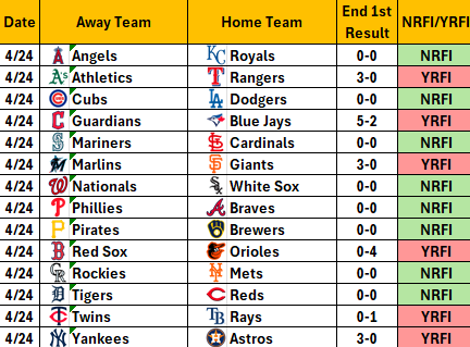Yesterday’s slate of games produced 8 NRFIs and 6 YRFIs.