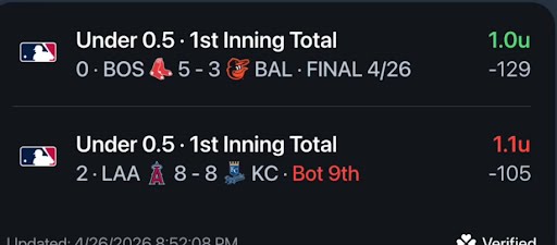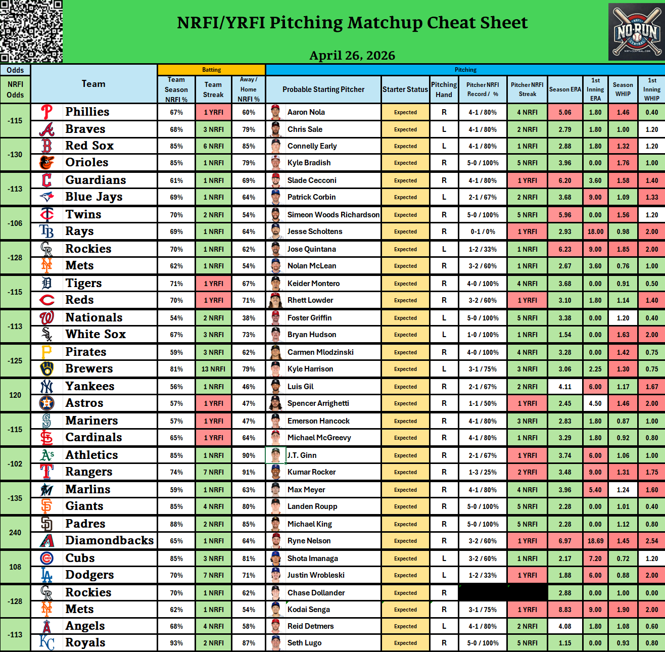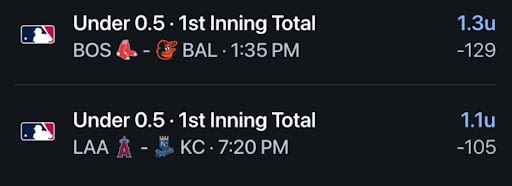 🏆 Connelly Early (Red Sox) – Decent NRFI arm (~80%) but limited sample and some inconsistency. More of an average profile than dominant.