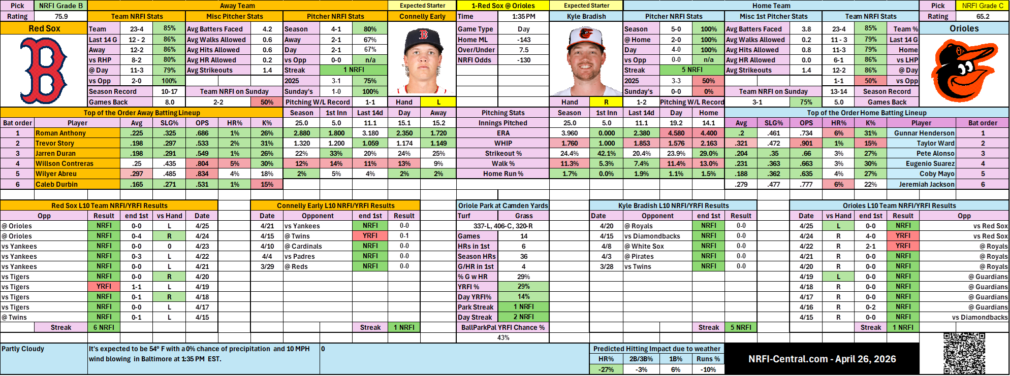 ⚔ Splits – Red Sox lineup leans contact and is less HR-driven early. Orioles lineup brings more power upside (Henderson/Alonso), creating added NRFI risk.